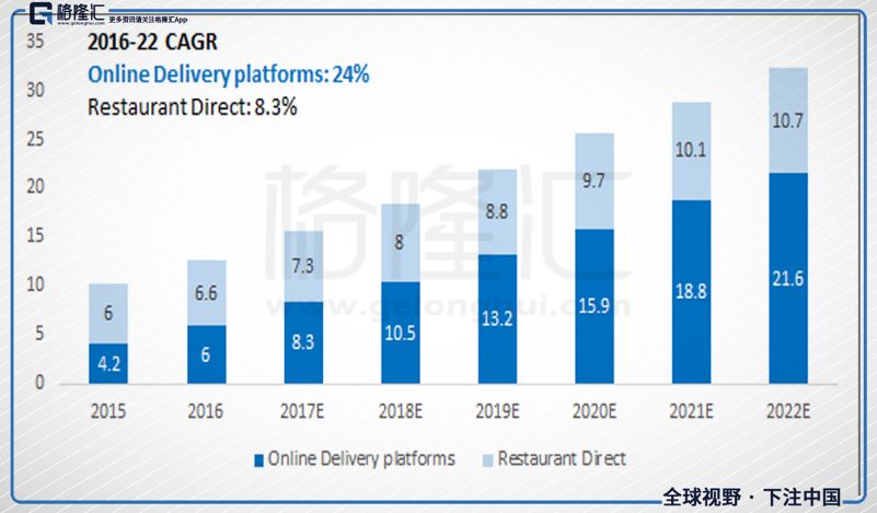 而根据Morgan Stanley预估, 2016-22年在线餐饮外送平台会以年均24%的速度在成长。 反观餐厅直接外送的成长率仅8.3%。 同时在2022年时,约有11%的餐厅业绩会来自于外送订单,远超过去年的6%--这相当于是四年内会多了US$32 billion的产值。另一方面,根据财富杂志所发表的一篇文章,在2017年中时,所有餐饮订单里,来自行动装置(手机或是平板计算机)的餐饮订单占了6%,已经超过了来自电话的订单(5%)。