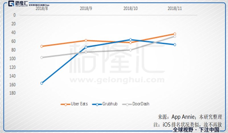 图十六、Uber Eats APP下载量也超过GRUB;APP下载排名-Android,名次(1为最多下载次数之APP);