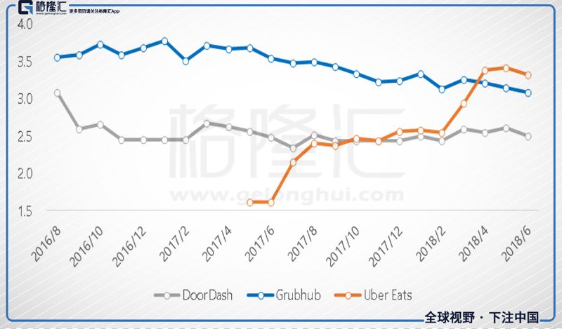 若只看专注第三方外卖的平台公司,可以从图八看出,美国外送市场之中,主要由GRUB、UberEats以及Doordash霸占,然而GRUB市占率在近一年的时间内缩减得特别快。