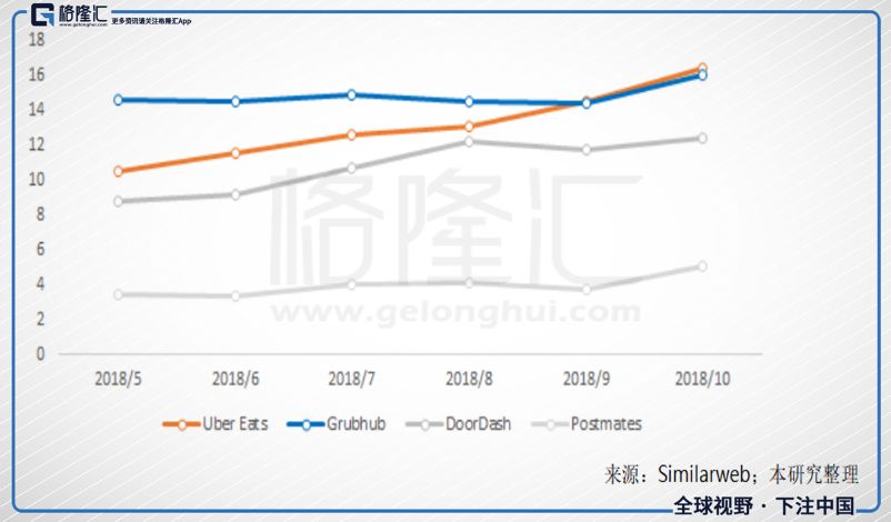 图十五、Uber Eats网站流量近期超越GRUB;网站流量,百万次;