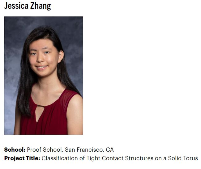 在今年40位获奖选手中,有16名华裔,占比40%,延续了亚裔在考试、比赛上的传统优势。其中,获奖学生Jessica Zhang,中文名张济杭目前她已经获得哈佛大学的提前录取。她的研究课题是「紧切触几何在实心环上的分类」(Classification of Tight Contact Structures on a Solid Torus)。张济杭就读于旧金山私立学校Proof School,这是一所专注于数学教育的小学校。她现在是12年级生,即将在今年毕业。她表示,学校很小,整一个年级只有11人。因为学校平时专注于数学的教育,一般整个下午都会上数学课,上午则是其他科学、文学、历史等课程。据了解,因为这所高中以数学教育闻名,在申请的时候,学生不一定要数学成绩多优秀,但是学校会希望入学的学生要热爱数学。她的父母是北京大学化学专业的同学,留学美国之后来到湾区工作便留下。