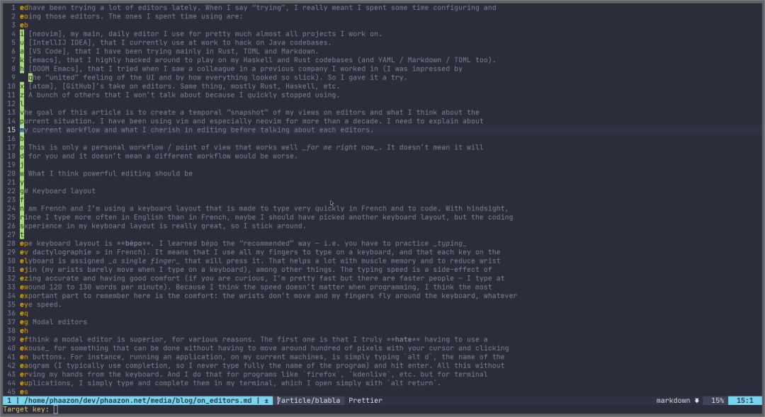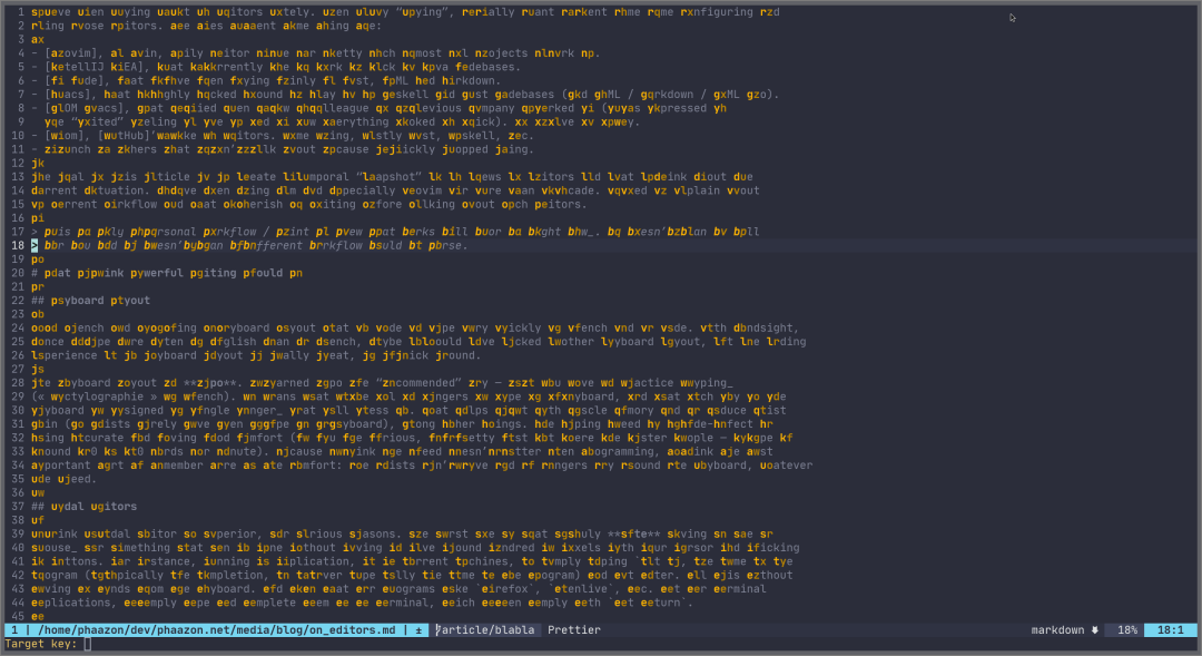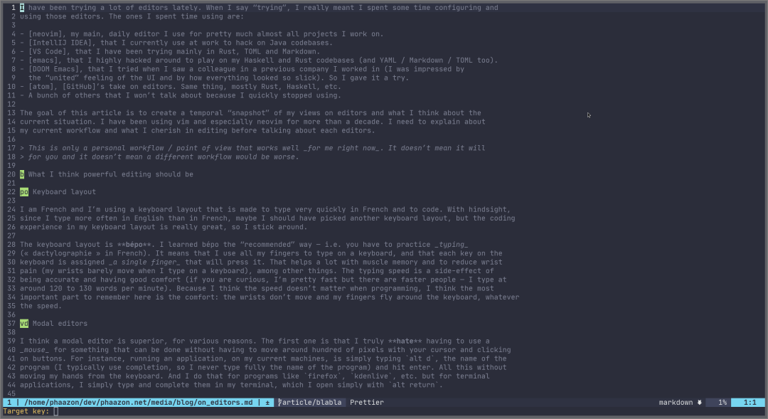 本文主要谈论个人对这些编辑器和该领域现状的看法(不喜勿喷)。我使用 vim,尤其是 neovim 已有十多年。首先,我会解释一下自己目前的工作流程、我对编辑器看重哪些方面。当然,文章仅是一家之言,不代表其他人的情况。