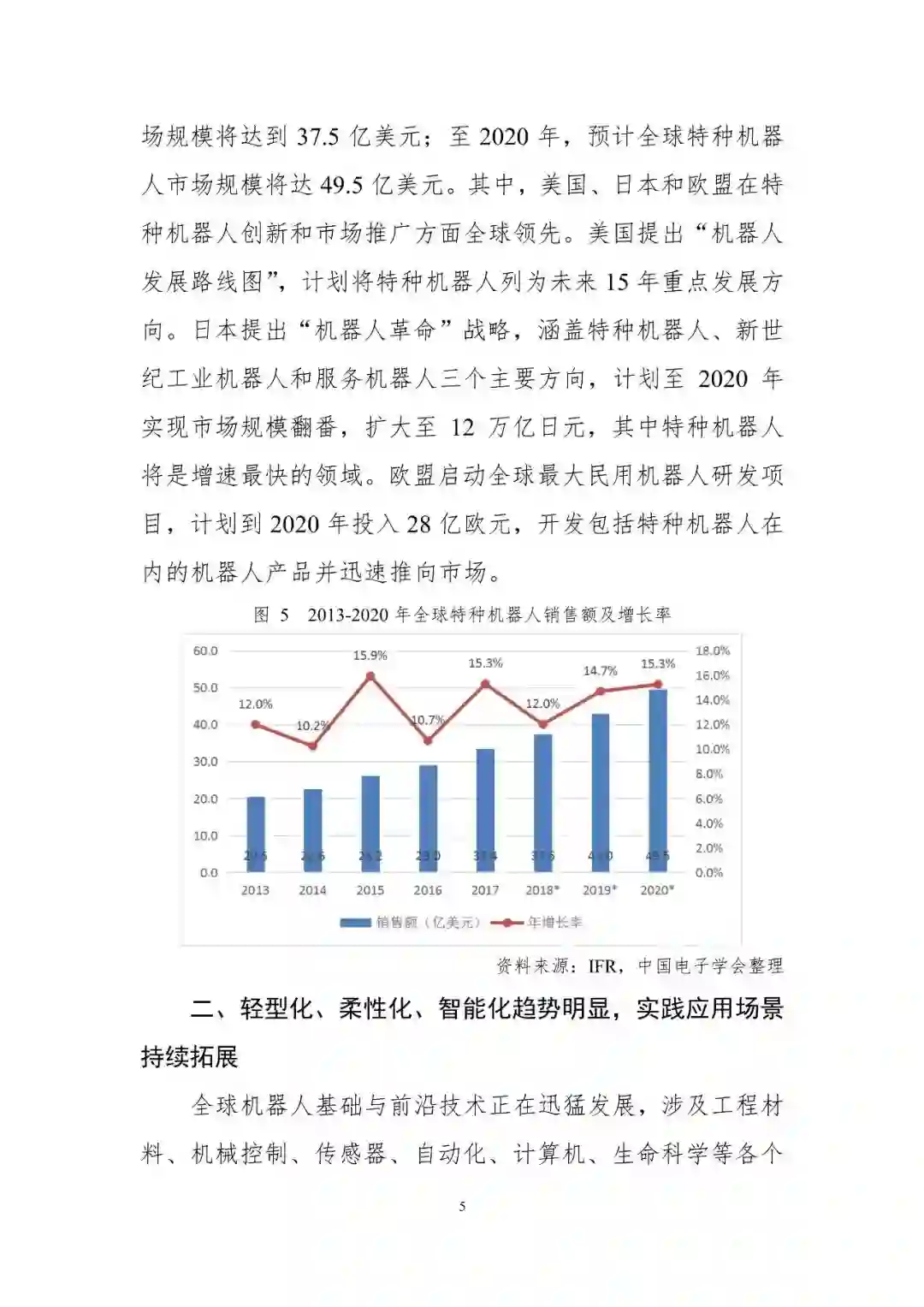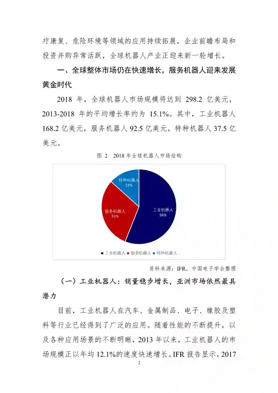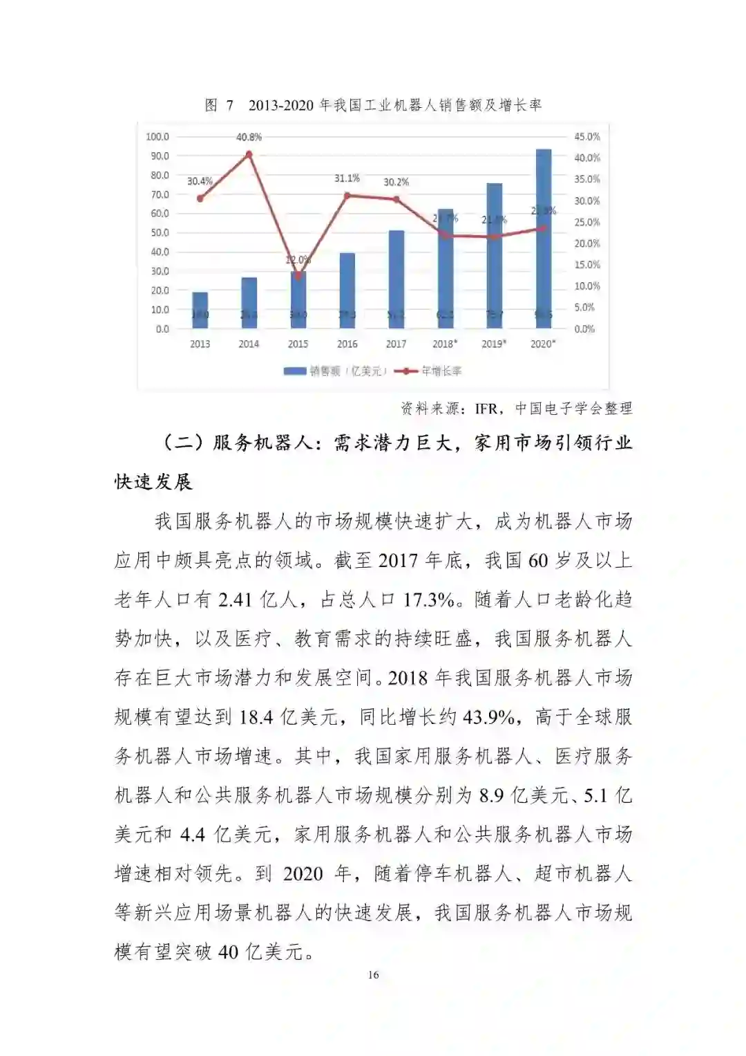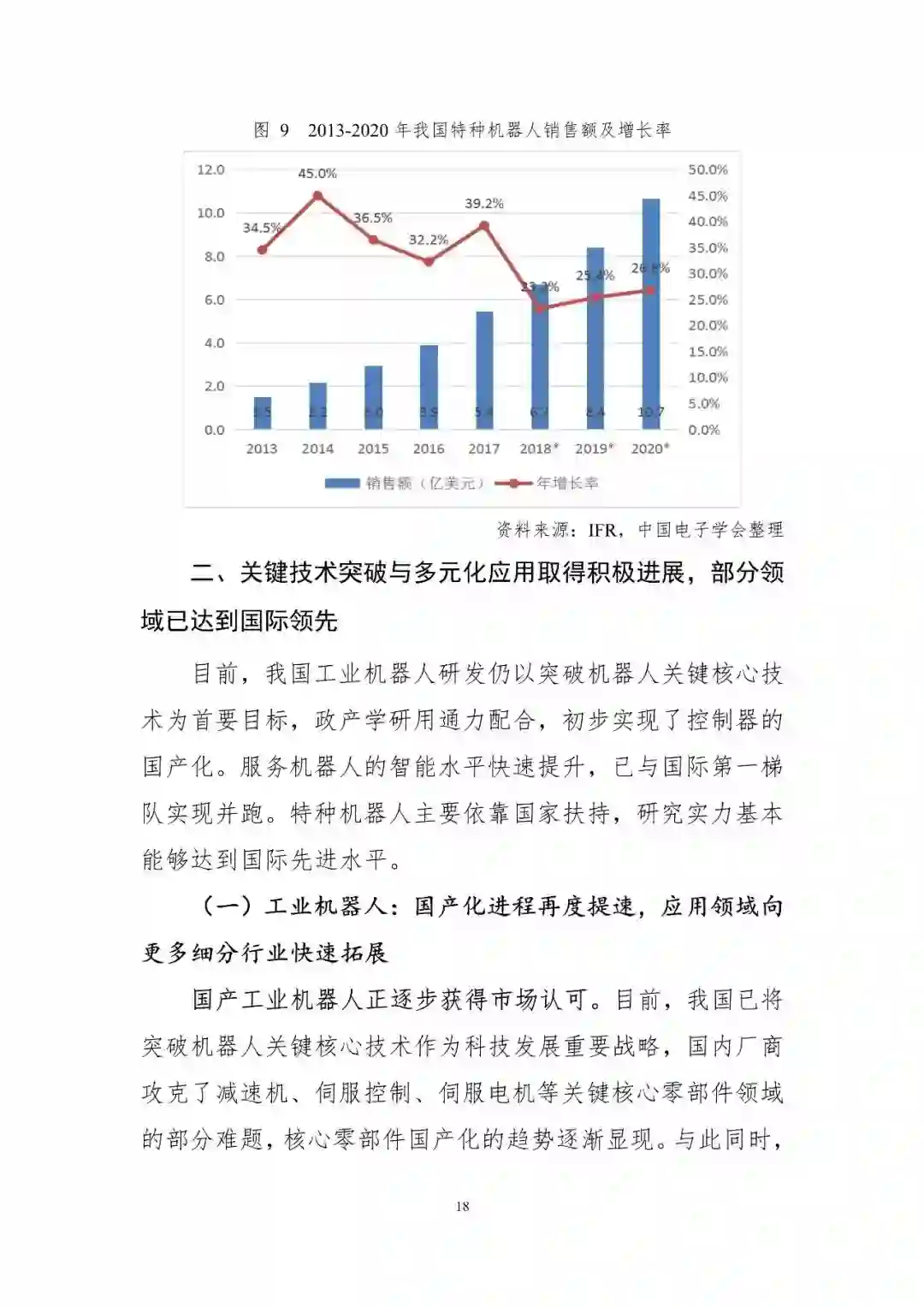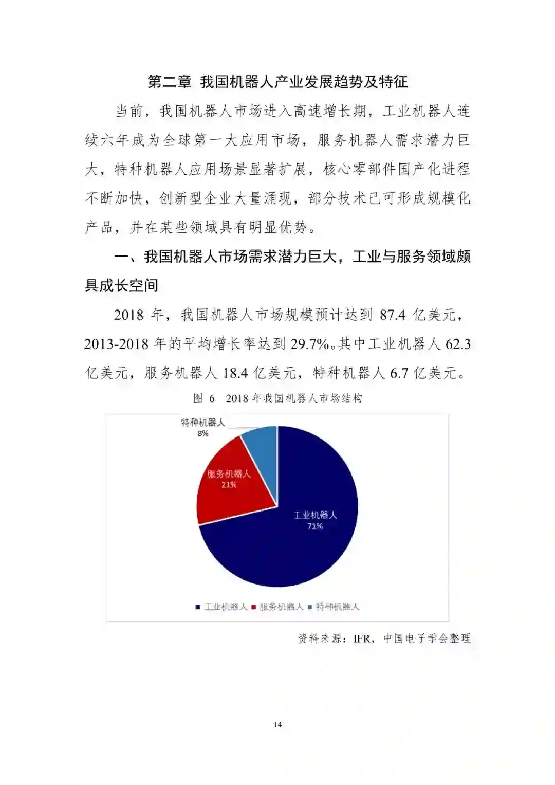 中国机器人产业在核心技术方面取得一定进步,市场规模快速增长,企业创新活跃。2018年,中国市场规模预计达到87.4亿美元,2013-2018年平均增长率约为29.7%。其中,工业机器人62.3亿美元,服务机器人18.4亿美元,特种机器人6.7亿美元。