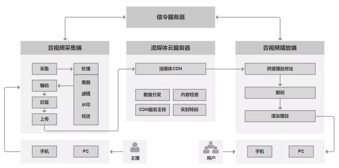 一个直播功能通用的基础架构涉及三个部分,即音视频采集端、云服务端和音视频播放端。