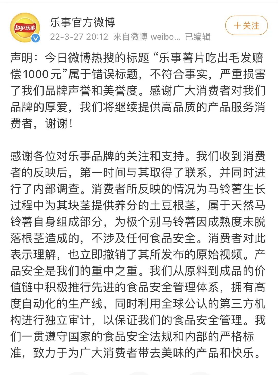 赔付1000元。27日,@乐事官方微博发布声明称,“乐事薯片吃出毛发赔偿1000元”不符合事实。消费者所反映的情况为马铃薯生长过程中为其块茎提供养分的土豆根茎,属于天然马铃薯自身组成部分,为极个别马铃薯因成熟度未脱落根茎造成的,不涉及任何食品安全。