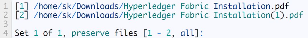 如果你想要每次保留每个重复文件集合的第一个文件,且无提示的删除其他文件,使用 -dN 选项(不推荐)。