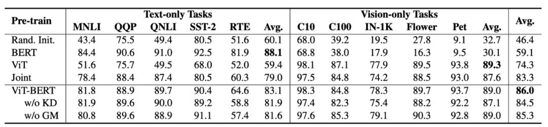 实验结果表明,与单独训练的BERT和ViT相比,图像和文本的联合预训练效果出人意料地好,不会导致下游任务的显著性能下降。所提出的知识精馏和梯度掩蔽策略可以进一步提高性能以接近单独训练模型的水平,验证了它们在预训练统一基础Transformer上的有效性。