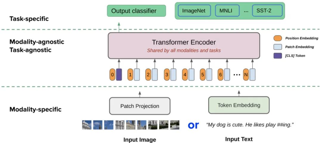 共享Transformer编码器: 所有模态和任务共享一个Transformer作为模型的主体;