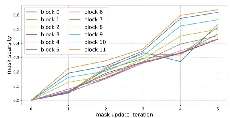 上图展示了在掩码更新的不同迭代时,Transformer编码器中所有块的掩码的稀疏性。