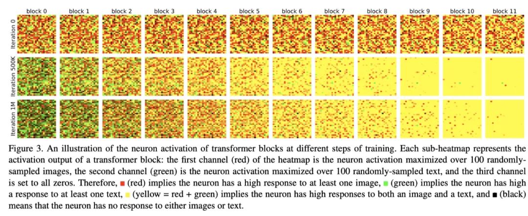 上图展示了在训练的不同步骤中,Transformer块的神经元激活值图示。