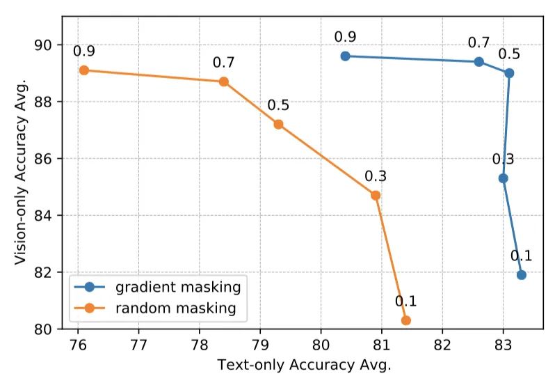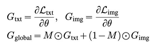 受神经网络剪枝结果的启发,作者提出了一种新的梯度掩蔽策略,以协调来自文本预训练和图像预训练的潜在冲突梯度。主要思想是,保留文本预训练的最重要梯度的子集,而忽略其他梯度,为图像预训练留出空间。设 θ 为共享Transformer编码器中的参数,分别为文本预训练任务和图像预训练任务的损失。作者通过一种自适应的掩码M将文本和图像预训练任务中的梯度结合起来: