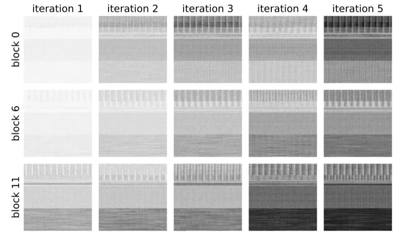 上图展示了在不同的mask更新迭代中,Transformer编码器块0、6和11的梯度mask的可视化。