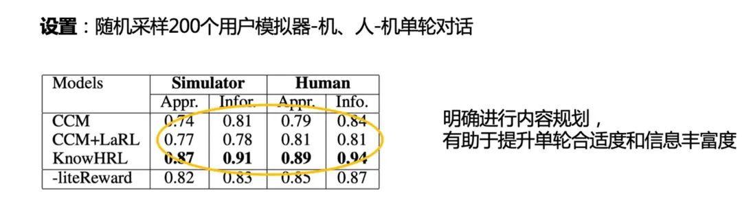 我们对比了SOTA知识增强的对话生成模型CCM[3]以及SOTA的基于隐变量的强化学习对话模型LaRL[4]。此外,为了验证所提奖励的有效性,我们设置对照组KnowHRL-liteReward,只使用常见的句间相关度和生成语句丰富度作为奖励信号。