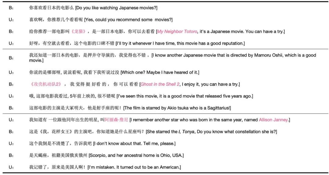上图给出了一段人机对话样例(使用中文对话,翻译成英文)。在对话中,模型一共同人聊了三个话题(标红的实体)。