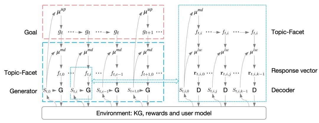进一步地,我们提出基于知识图谱的三层层次化强化学习模型(KnowHRL)。其中,上层负责学习在知识图谱上规划话题序列;中、下层协同完成围绕话题的深入聊天。具体而言,中层在选定话题节点的邻居中选择一个可聊侧面;下层负责基于给定话题和话题可聊侧面同用户进行多轮对话。