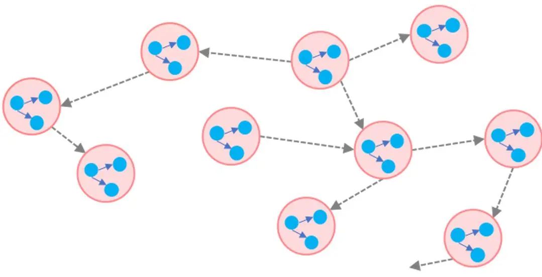 我们首次提出将开放域对话任务分为对话话题规划和围绕话题深入聊天两个子任务,下面的示意图显示了这个过程。浅红色大圆圈代表聊天话题,里面的蓝色节点和边代表了围绕该话题的深入聊天。系统跟用户聊完一个话题再聊下一个话题。