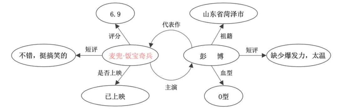 术语解释:本文中,受限于资源,我们将对话目标设定为围绕特定话题聊天。为了描述的方便,后续将使用“聊天话题”一词代替“聊天目标”。值得注意的是,本文所提框架支持多种对话目标,包含任务完成、对话推荐等。我们定义话题为知识图谱中的节点,进一步地,为围绕话题深入聊天,我们定义话题可聊侧面为知识图谱中关于该话题的的三元组。如下图中,节点《麦兜·饭宝奇兵》是一个话题,而该话题的一个聊天侧面可能是【《麦兜·饭宝奇兵》,主演,彭博】,表明该话题可以深入聊它的导演。