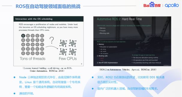 其次,ROS 是一个分布式的系统。既然是分布式,就要有通信的开销。即使在同一个物理节点上,依然存在着通信的开销。所以 Apollo 前期曾经使用共享内存去降低 ROS 原生的基于 Socket 通信的开销。ROS 2 也在使用 DDS 解决通信方面的实时性。ROS 也支持 Nodelet 模式,这可以去掉进程间通信的开销,但是调度的挑战依然存在。