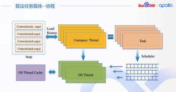 Cyber RT 使用了协程作为算法任务的载体。协程之于线程,就类似于线程之于物理 CPU,由 Cyber RT 中的调度器负责在各个线程之上周而复始,切换调度协程。为了算法模块在其他协处理器执行计算时,可以让出Processor(Native Thread),并在完成之后,回来时可以再次运行,Cyber RT采用了有状态的协程。