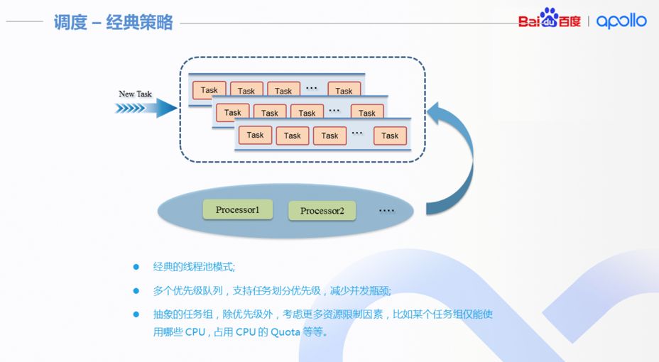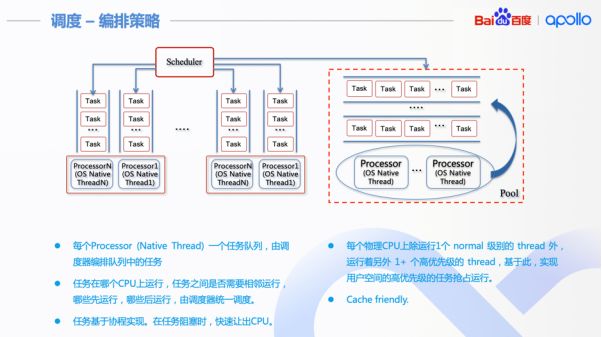 ROS 的主要挑战之一是没有调度,为了解决 ROS 遇到的问题,Cyber RT 的核心设计将调度、任务从内核空间搬到了用户空间。调度可以和算法业务逻辑紧密结合。