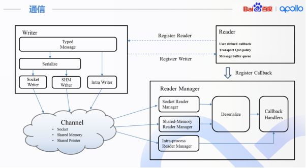 实际部署中,也存在着比如某个工具需要运行在独立的进程,安全系统部署在另外的节点。因此,Cyber RT 也支持跨进程、跨机通信。上层业务逻辑无需关心,通信层会根据算法模块的部署,自动选择相应通信机制。