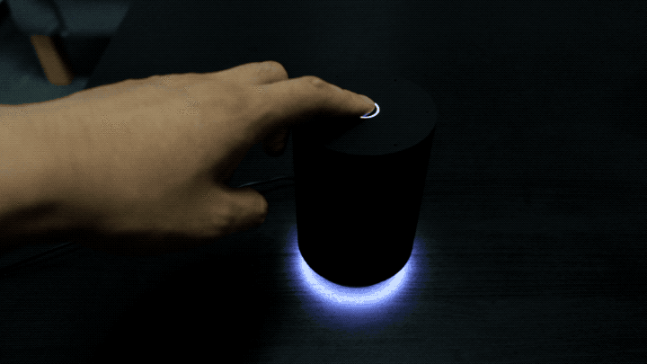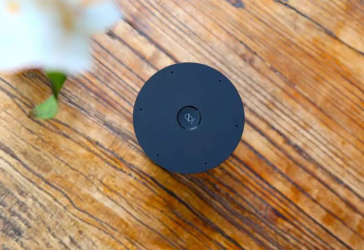 天猫精灵 X1 的顶部有一个物理按键和两个触控按键。物理按键负责关闭/打开麦克风和喇叭,可以实现「一键静音」的功能;触控按键则负责音量的增减,操作时音箱底部会以灯光强弱变化进行反馈。