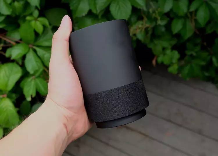 天猫精灵 X1 采用了圆柱形的设计,它的体积非常小巧,比我们之前评测过的 Google Home 还要小上一圈。它的外壳采部分采用了「二段式」的设计,上半部分是涂有亲肤材质的塑料,下半部分则包裹着纹路细腻的网布。天猫精灵 X1 整体的设计规整、简单,好处是放在家里的任何位置都不显得很突兀。