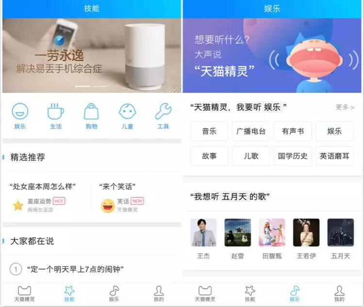 在音频内容上,天猫精灵接入了虾米音乐和喜马拉雅 FM,除此之外还有像「乐只」、「闹闹女巫店」这些服务商提供的个性化内容。如果你不知道要听什么,在天猫精灵 X1 的 app 内会有一个指引,告诉你它都能播放哪些内容。对于之前没有接触过智能音箱的用户来说,这样的引导工作是有一定价值的。