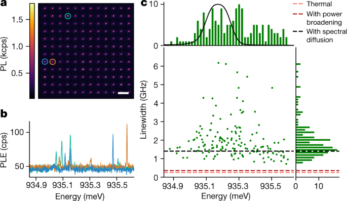 在磁场作用下,每个 T 中心的自旋量子比特态具有略微不同的能量,并且各自发射不同波长的光。这让科学家们可以通过光学检测探知 T 中心自旋量子比特的状态。