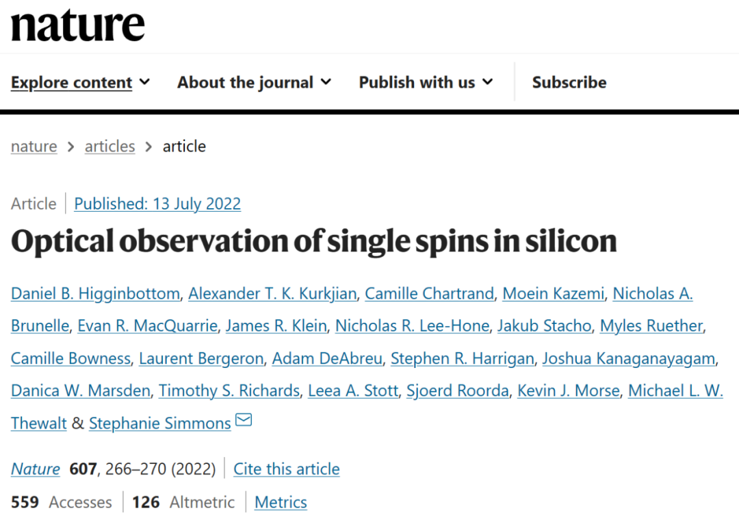 西蒙弗雷泽大学的研究者首次在硅量子比特中通过光学方式检测到单自旋。Simmons 认为,这种对自旋量子比特的光学访问有朝一日可能利用光让量子比特在芯片上相互纠缠。
