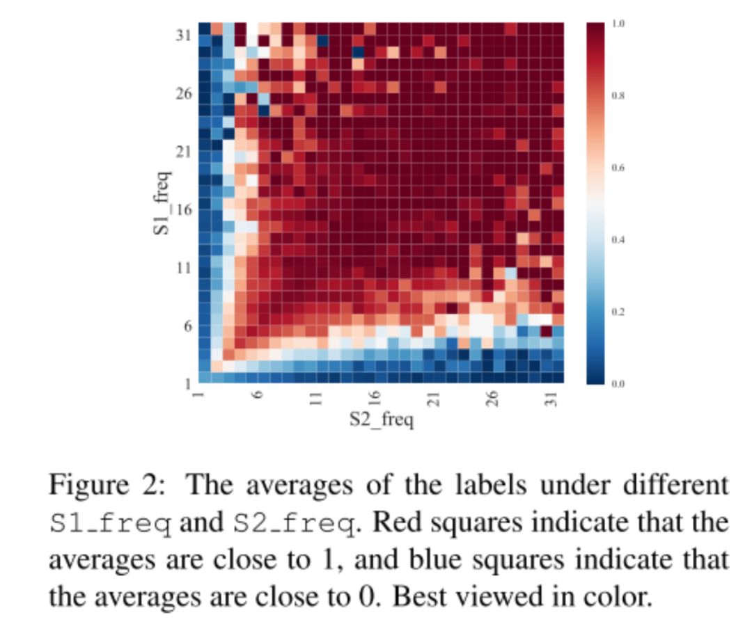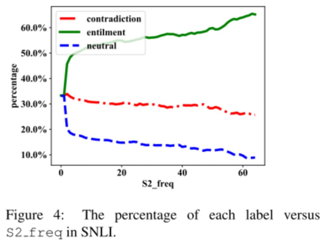 在 SNLI 的准备过程中,标注工人们需要根据给定的“句子 1” (premise scene descriptions) 为三种标签分别写一个“句子 2”。而在这个过程中发现,工人们会根据标签重复使用一些句子来做"句子 2",我们推测正是这种“复用”的操作导致了 SNLI 有偏。如下图,我们可以发现在 SNLI 中,随着 S2_freq 的增大,标签变得更倾向于是 Entailment。
