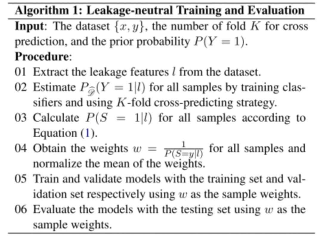 我们证明,通过对模型在训练和评估的时候添加适当的 sample weight,可以等价于在 Leakage-Neutral 分布中训练和评估。算法的流程图如下,指的是原本有偏数据集的分布,具体证明见论文。