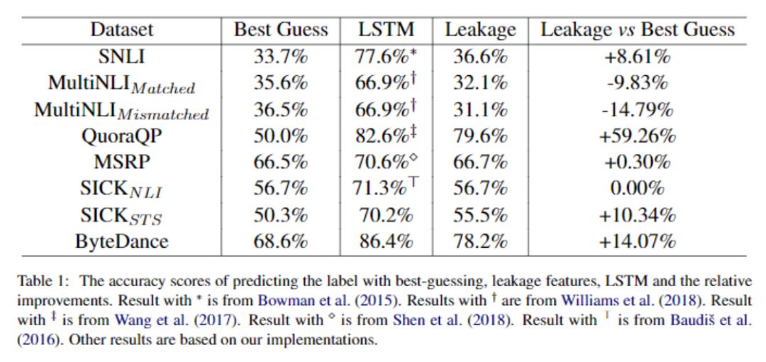 从表 1 可以看出,六个数据集中有四个都不同程度的受到 bias的影响。在 QuoraQP 上,只使用三个 Leakage Feature 甚至可以达到和 LSTM 差不多的结果。