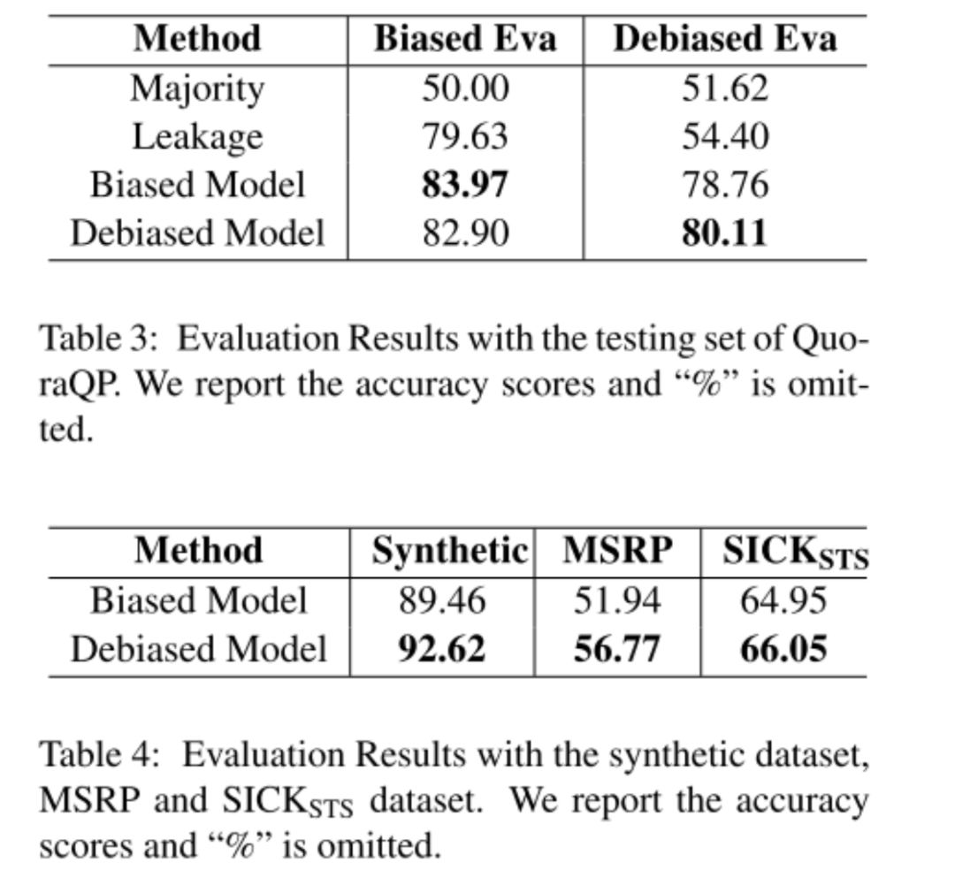如图三所示,Debiased Model 在有偏评估中低于 Biased Model,这是因为 bias 在原测试集中有预测能力。而在加权评估中 Debiased Model 高于 Biased Model,这是因为加权测试中 bias pattern 没有预测能力,当模型捕捉到 bias 并利用其进行预测,这实际上会起负作用。