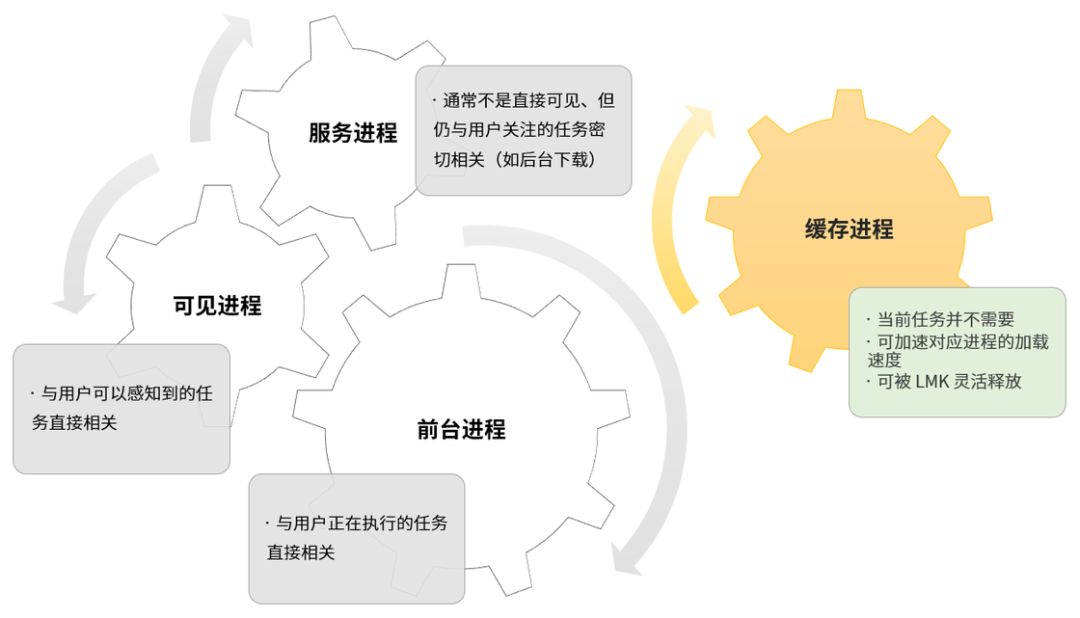 在一个正常运行的(Android)操作系统中,缓存进程应是内存管理机制唯一需要交互的部分: 一个运行良好的 Android 系统通常会在运行内存中暂存多个缓存进程以随时调用,提高应用间的切换效率,同时对那些较为老旧的不活跃进程进行有计划的回收。