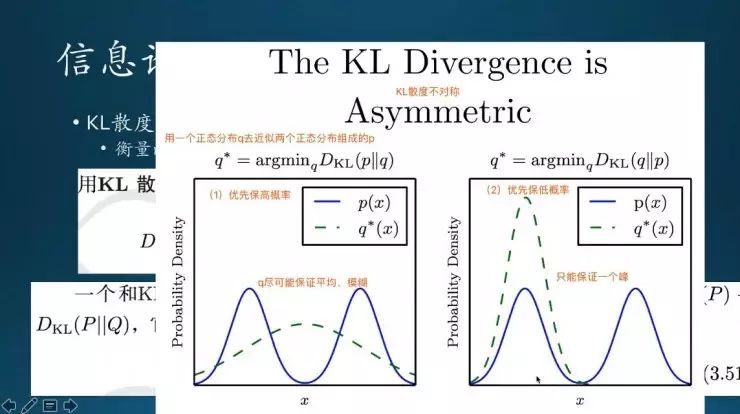如果用左边的KL散度,p在前q在后,那我们会得到这样一个结果;绿色的是拟合的概率。它的效果是保证在高概率的地方,拟合的概率要高,而不考虑低概率的部分,所以结果就会做一个平滑。概率的总和还是1,要保证归一性嘛。右边反过来,q在前p在后,那么低概率要优先保证,高概率就忽略了,那么这个拟合的概率分布就尽量往一个峰靠,只能保证一个峰。这就解释了KL散度不对称性的应用,可以按照不同的应用场景取不同的方向。