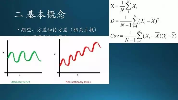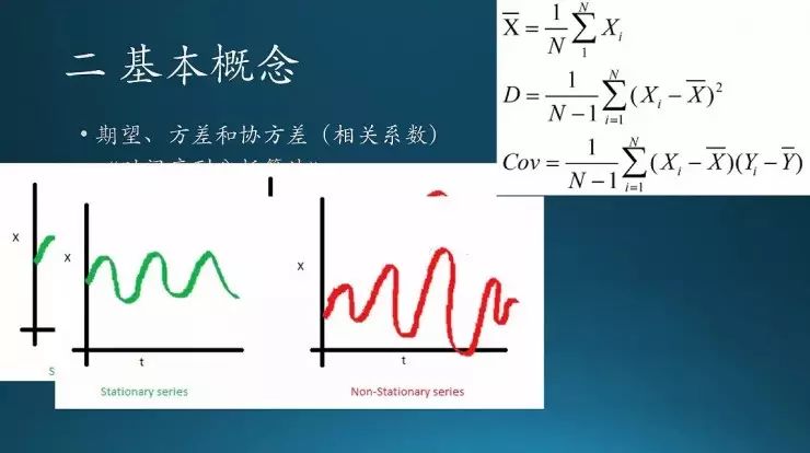 还有一个叫协方差,自己跟自己比的话,每一次变化的周期要一致。像这个红色序列前面周期比较长,后面周期变短,然后又长了,它的周期就一直在变化,这个也是不稳定的。