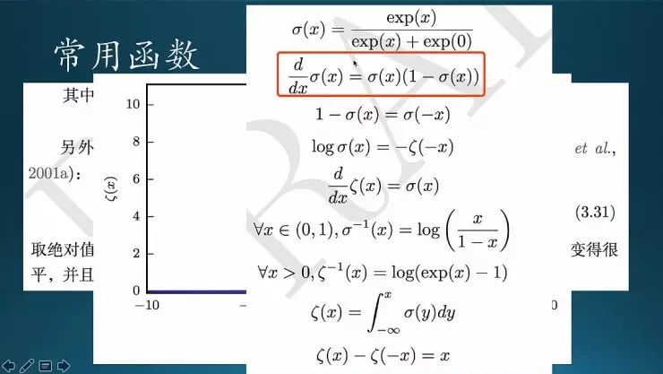 还有一个softplus,它是softmax的一种弱化;softmax从右往左下降会直接到0,在0的位置有一个突变,然后继续走;0这个点的左导数和右导数是不一样的,左导数是0,右导数是1,所以0这个点上的导数是不存在的。怎么办呢?为了数学上面好看,而且求导方便,那就把它变成softplus,在0这个点做变换之后就整个平滑起来,每个点的都是可导的。实际上在书里面也提到一点,平时其实深度网络DNN里面会经常用到ReLU,ReLU里就是softmax。softmax是ReLU的一种推广。ReLU里0点也是不可导的,就有一些规则的方法,就是如果到了这个点的话,他会给要么是0,要么是1,视具体情况而论。