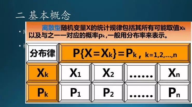 这是离散型的概率分布,X这个事件取得X1、X2等等情况的可能性。这是离散概率分布,如果是连续的话就变成积分的形式了。