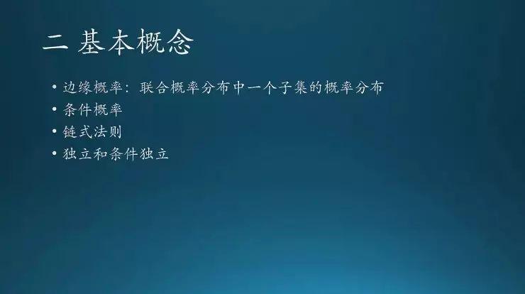 介绍几个概念。边缘概率是,如果联合分布涉及到x、y两个事件,那么固定x看它的平均分布,这叫边缘概率。条件概率是在一个事件发生的时候,另外一个事件的概率分布。