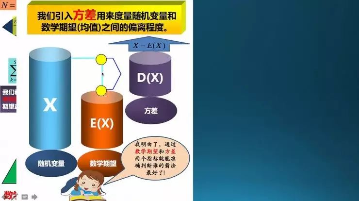 方差的形象理解,就是期望对每一个值之间的差别,取平方、求和取近似均值(除N-1)。