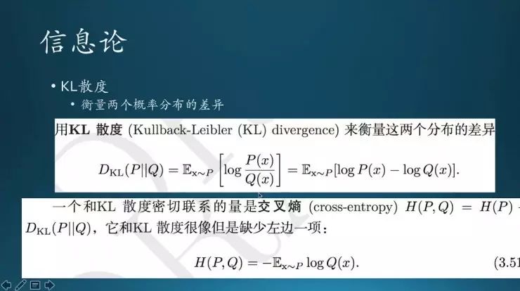 这里还有一个KL散度,基本上是衡量两个概率分布的差异。这个公式也很复杂,你们自己去琢磨,必须要看,看一遍然后才有直观的理解。现在讲也讲不清楚。(注:信息论也可以形象起来,参考:colah's blog,Visual Information Theory)