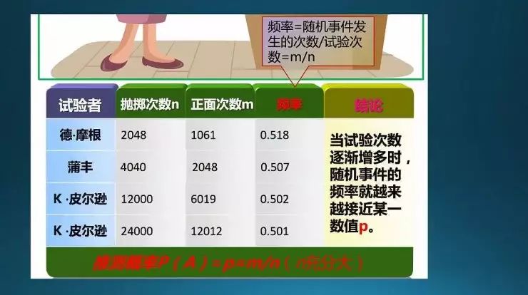 前人做了一些实验——抛硬币,观察出现正面的可能性。可以看到2048次还是0.51,然后越来越多的时候,趋近于事务本身:抛硬币时,正面反面应该是1/2的概率。就是说实验次数越多,它越趋近于事件本身发生的概率,这个也叫大数定律。(注:皮尔逊真傻,扔了3.6w次,哈哈,科学家好像都挺“傻”的)