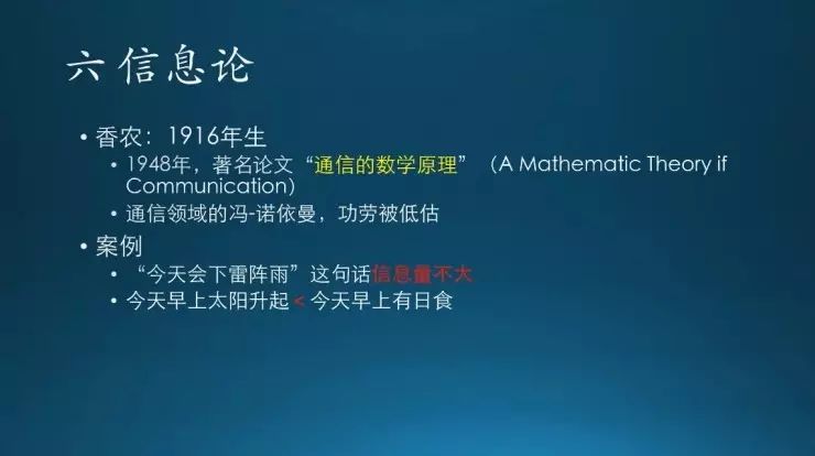 下面介绍一下信息论。信息论是香农这个人提出来的,在1948年他发表了一篇论文叫“通信的数学原理”,对信息通信行业的影响非常大,相当于计算机行业的冯诺依曼这个级别。不过他的功劳一直被低估(吴军《数学之美》)。