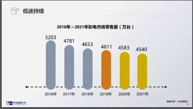 乐视电视业绩辉煌的2016年,正是彩电行业的一个拐点。从2016年开始,彩电行业销量开始下滑,进入低迷时期。根据中怡康的统计和预测,2017年中国市场彩电零售量同比下滑8.1%,是过去15年下降幅度最大的一年。同时,2016年到2021年,彩电市场零售量将会持续下滑。