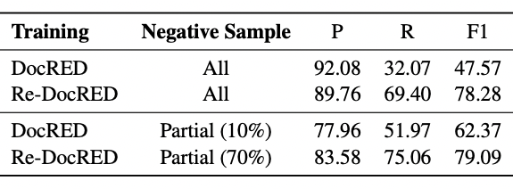 如果我们将原有的 DocRED 用作训练集,而所训练的模型(KD-DocRE)在 Re-DocRED 的测试集上测试,其表现仅能达到 47.57 F1,而如果仅随机采用 10% 的负类样本进行训练,其模型表现可以达到 62.37 F1。后续的研究可以继续探索如何克服训练数据中的假负例问题。