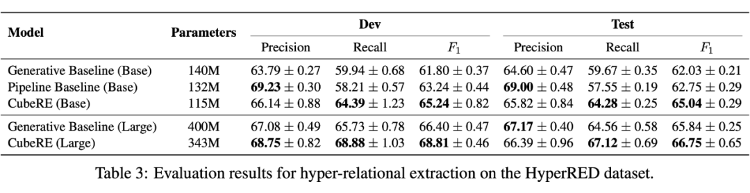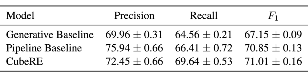 实验结果表明,我们提出的模型优于两个基线模型。与两阶段基线模型相比,CubeRE 可以端到端地抽取超关系事实,避免错误传播问题。与生成基线模型相比,我们的方法能够明确考虑关系三元组和限信息之间的交互,以更好地抽取超关系事实。