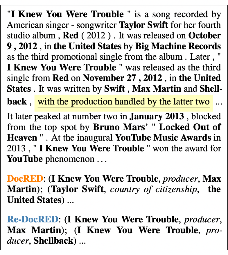 在我们的初步研究中发现,DocRED 数据集中存在大量漏标的实体关系,并且同时存在于训练和测试集中,这些漏标的实体对被称为假负类样本(False Negative Example)。假如一个实体对存在特定关系,但在测试集中未被标注,即便模型预测出了该关系也会被判为错误。如图 1 所示,从高亮的句子中可以推测出 Max Martin 与 Shellback 都是流行歌曲 I knew you were trouble 的制作人, 但是 DocRED 数据集中仅标注了 Max Martin。