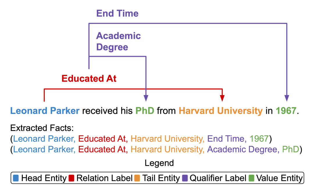 (Hyper-Relational Fact),可以更好地代表丰富而复杂的知识图谱结构。例如,关系三元组(Leonard Parker,Educated At,Harvard University)可以通过限定信息(End Time,1967)变成更完整。