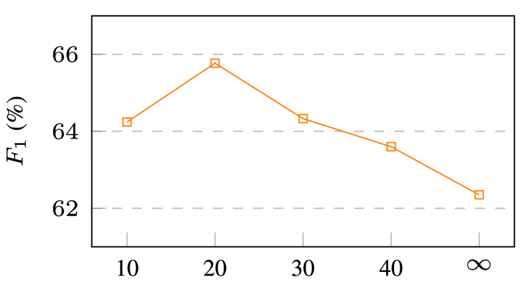 除了提高 CubeRE 的计算效率外,我们的立方体剪枝方法还可以提高模型的抽取性能。在训练过程,模型面临着负类的不平衡,从而偏向于负类的预测。我们通过仅考虑与较高实体分数相关的单词来剪枝立方体,缓解了负类不平衡问题。上图中的趋势支持了这一点,因为放宽剪枝阈值会让负类越不平衡,导致性能下降。另一方面,过于严格的剪枝会导致模型只能抽取少数量的超关系事实。